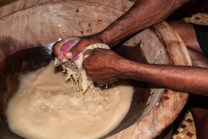 At the start of the ceremony of Fijian kava villagers grind the kava roots and strain the pulp in a large wooden bowl placed at the center of the room through a cloth bag. Then the kava is offered first to the head of the group and second to the village head but the village head drinks it prior to everyone else. Though kava is drunk by both the genders but men drink it before women.